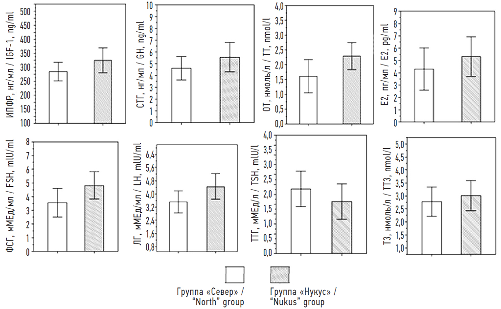 RESULTS: This analysis revealed statistically significantly higher values of TT, FSH and LH in children from the “Nukus” group compared to their peers from the “North” group. The concentrations of IGF-1, GH, E2, TTG and T3 in blood plasma in volunteers from both groups were not statistically significantly different.