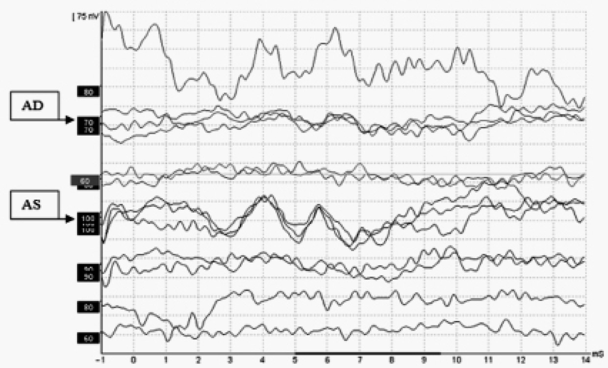 Рис. 1. Результаты 2-го этапа аудиологического скрининга (2016) — порог регистрации коротколатентных слуховых вызванных потенциалов по воздушной проводимости справа (AD) 70 дБ, слева (AS) 100 дБ над порогом слуха
