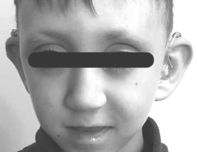 Fig. 3. Facial features characteristic of the Kabuki syndrome, of the patient: arched eyebrows with a sparse lateral part, a wide tip of the nose, large low-lying ears with protruding tips (2022)