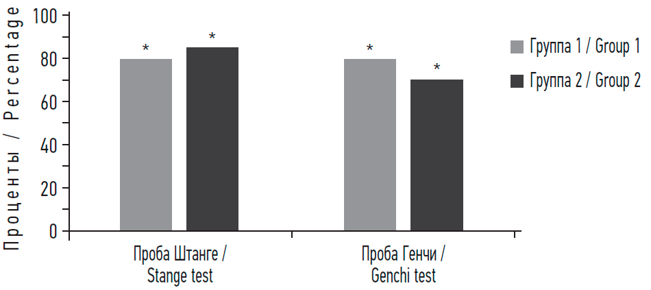 После статистической обработки показателей нагрузочных проб Штанге и Генчи были обнаружены низкие показатели задержки дыхания достоверно чаще в обеих группах, чем в КГ (p < 0,001). В 1-й группе снижение пробы Штанге выявлено у 19 (79,2 %) детей, а Генчи — у 15 (62,5 %), а во 2-й — у 51 (85 %) ребенка и у 42 (70 %) пациентов соответственно (рис. 3). Между обследуемыми группами статистически значимых различий не выявлено (рис. 3).