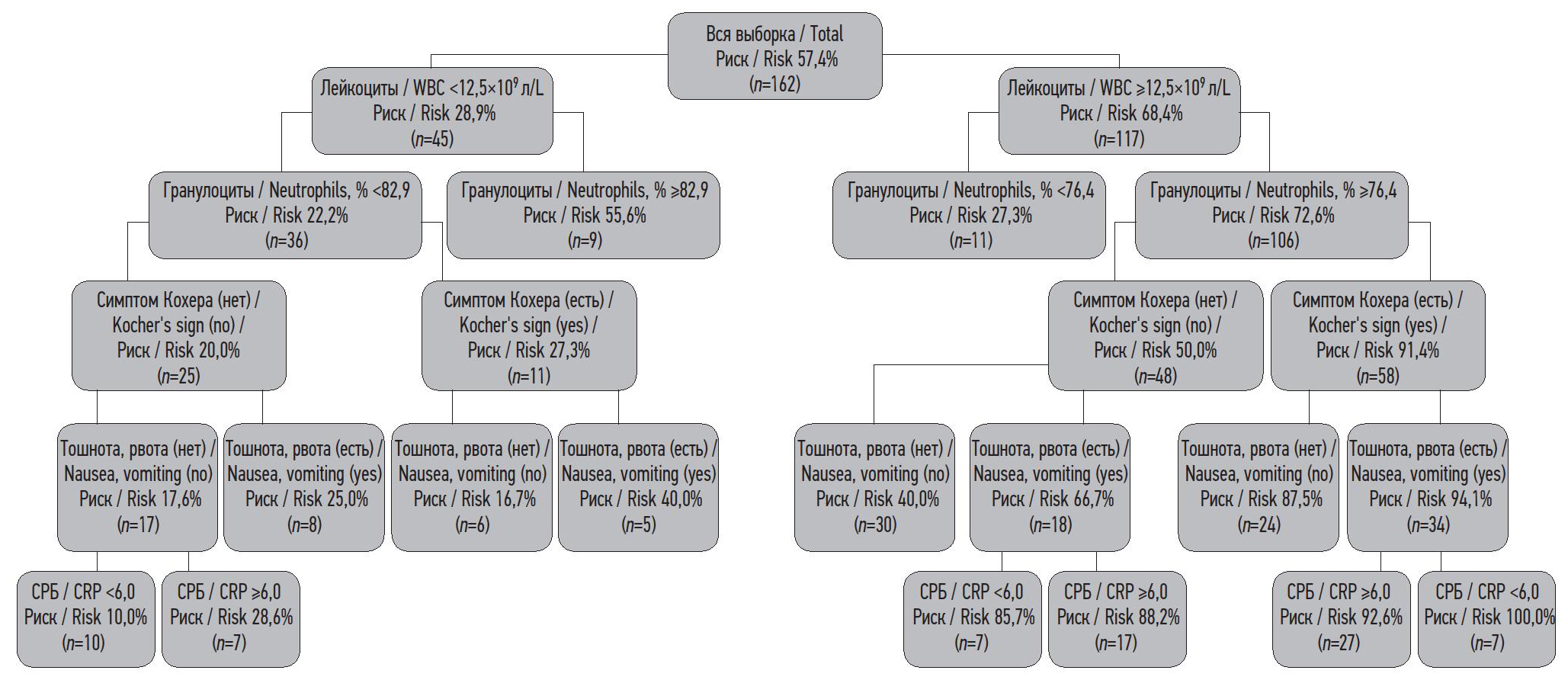 Результаты. При проведении сравнительного анализа выделены наиболее значимые предикторы острого аппендицита у беременных: концентрация лейкоцитов в крови ≥12,5×109/л [относительный риск (ОР) (доверительный интервал, ДИ) 2,37 (1,47–3,80)], С-реактивного белка ≥21,0 мг/л [ОР (ДИ) 1,72 (1,36–2,17)], положительный симптом Кохера [ОР (ДИ) 2,01 (1,50–2,69)], а также процентное содержание гранулоцитов ≥78,0 [ОР (ДИ) 2,2 (1,29–3,77)] и наличие тошноты/рвоты [ОР (ДИ) 1,35 (1,03–1,76)]. На основании полученных данных однофакторного анализа разработана диаграмма дерева решений с определением риска вероятности развития острого аппендицита. Предложенная диаграмма дерева решений обладает хорошей чувствительностью (65,9%) и специфичностью (92,1%) при AuROC 0,86.
