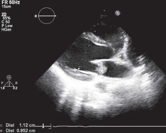 Fig. 4. ECHO of 16-year old female patient A. Parasternal long-axis view. Vegetations on the mural leaflet of the mitral valve