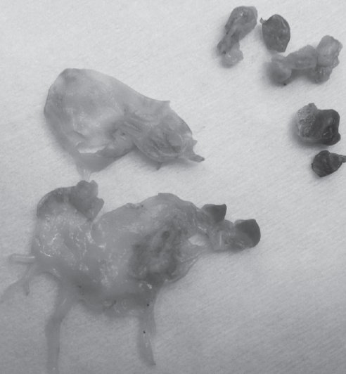 Рис. 8. Макропрепарат: створки удаленного митрального клапана с вегетациями.