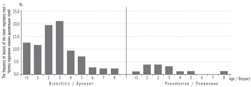 Fig. 3. The frequency of lesions of the lower respiratory tract with metapneumovirus infection, depending on age / Рис. 3. Частота поражения нижних дыхательных путей при метапневмовирусной инфекции в зависимости от возраста