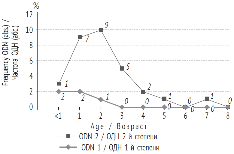 Complications in the form of acute respiratory failure (ARF) were observed in 31 patients, which is 22.3% of all children with lower respiratory tract involvement (Fig. 4). ARF of varying degrees was detected in patients under the age of nine years, and significantly more often in children during the first three years of life compared with children of older age groups – 71.0 (n = 22) versus 29.0% (n = 9), respectively (p = 0.038). ARF Degree 2 developed exclusively in children under three years of age, and the frequency of manifestations of respiratory failure decreased with increasing age of the observed patients. So, in children during the first year of life, three (9.7%) ARF cases were recorded: two of Degree 2 and one of Degree 1 at the age of 1 year, only nine (29%) cases; two of Degree 2 and seven of Degree 1 at the age of 2 years, 10 cases (32.3%); one of Degree 2 and nine of Degree 1 at the age of 3–4 years; and Degree 1 in seven (22.6%) people; 5–6 and 7–8 years old with one observation each.