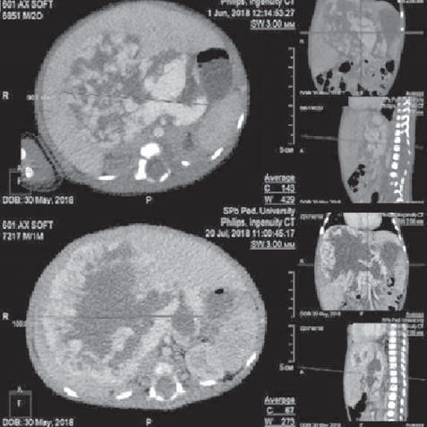 По данным контрольного МСКТ брюшной полости с контрастным усилением (ноябрь 2019 г. — возраст ребенка 5 мес.): образование уменьшилось в размерах по всем измерениям, общий его объем уменьшился на 32 %.