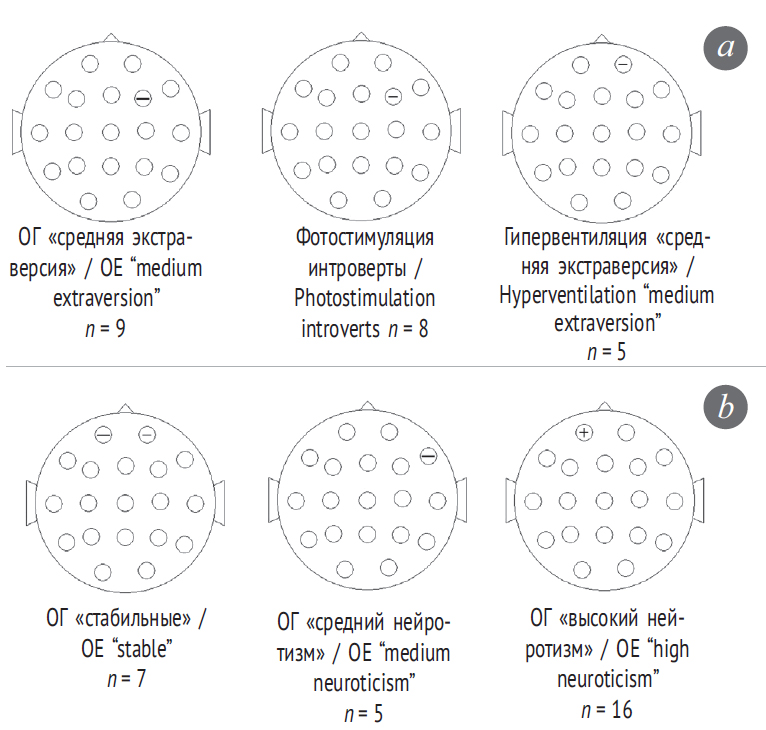У испытуемых с низким уровнем нейротизма («стабильные») и у интровертов значимые корреляции с параметрами ЭЭГ выявляются чаще, чем в других группах. У интровертов это можно объяснить более существенным вкладом внутренних источников в активацию коры, у испытуемых с низким уровнем нейротизма — особенностями функциональных связей коры, обеспечивающих «стабильность» эмоциональных реакций и поведения. Для отдельных групп испытуемых различия в характере взаимосвязей параметров ЭЭГ с показателями экстраверсии и нейротизма чаще проявляются в относительно активном состоянии (открывание глаз, гипервентиляция, фотостимуляция), чем в состоянии полного покоя с закрытыми глазами. Это может указывать на отличия динамики функциональных связей при переходе от покоя к активности.