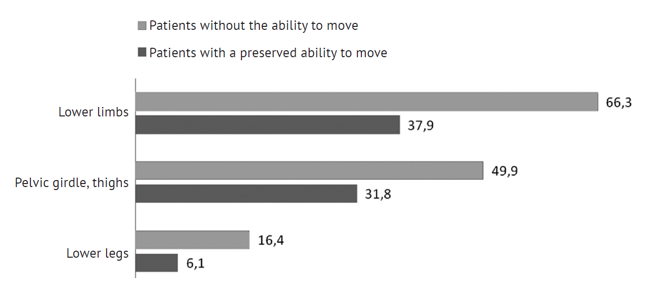 In patients unable to move, the greatest muscle strength was noted in the flexor muscles of the toes (mean score 3.8). In the synergistic muscles, on flexing the foot, the mean was 3.5. When assessing the strength of extension of the toes, the mean score was also 3.5. The lowest muscle strength was observed in the extensor muscles of the foot (mean score 3.0). The results are provided in Figure 2.