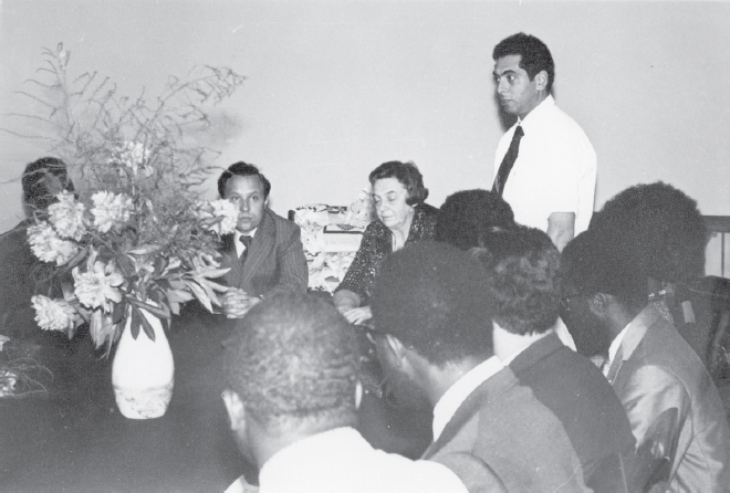 Fig. 3. A.V. Papayan speech at the meeting of the Rector’s Office dedicated to the training of foreign students. In the center, the rector of the LPMI, рrofessor G.A. Kaisaryants (1973)