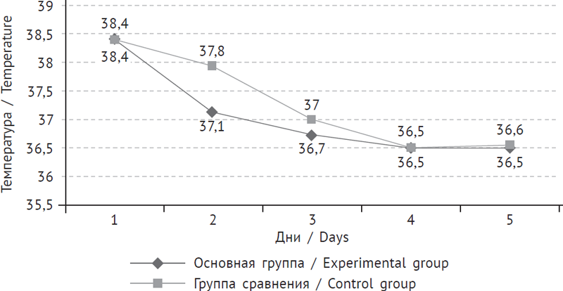 Рис. 3. Эффективность препарата Виферон® при вирусных диареях (динамика лихорадки)
