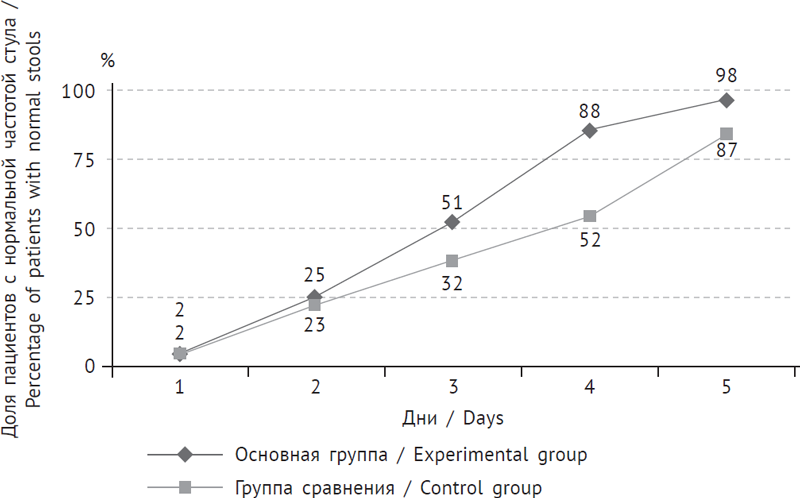 Продолжительность диареи в основной группе составила 3,9 ± 0,9 дня (рис. 5), в группе сравнения — 5,1 ± 1,0 дня (p < 0,05). Одновременно с нормализацией частоты и характера стула у больных, получавших препарат Виферон®, быстрее исчезали патологические примеси в стуле (слизь, зелень), что свидетельствовало о положительном влиянии препарата на процессы репарации кишечника.